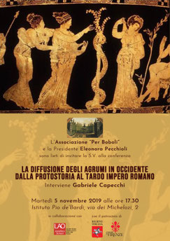 L'Associazione "Per Boboli" è lieta di invitarvi martedì 5 novembre 2019 alle ore 17.30, nella nuova sede presso l’Istituto Pio de’Bardi (via dei Michelozzi, 2 - Firenze), alla conferenza “La diffusione degli agrumi in occidente dalla protostoria al tardo impero romano” a cura dell’Arch. Gabriele Capecchi.